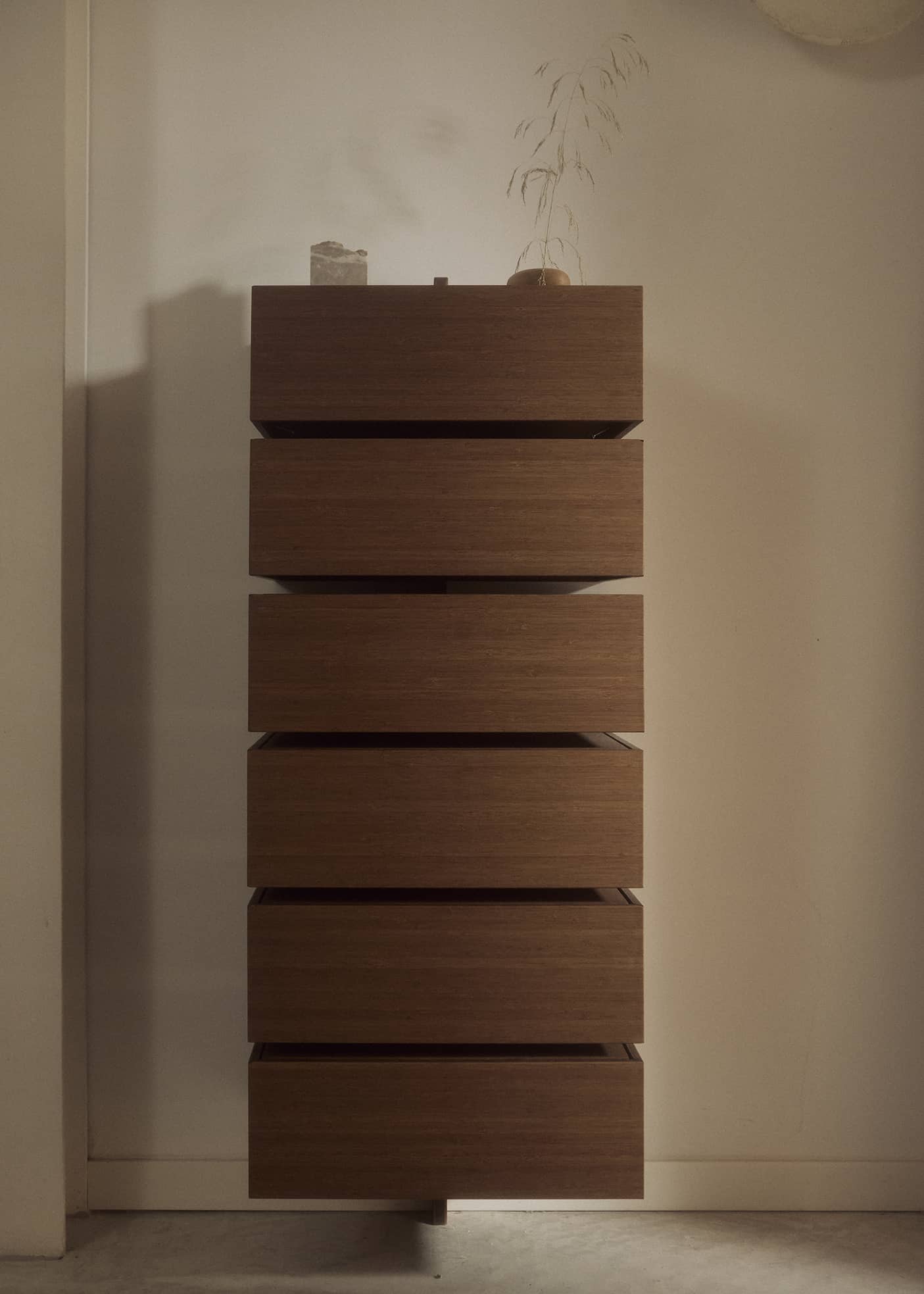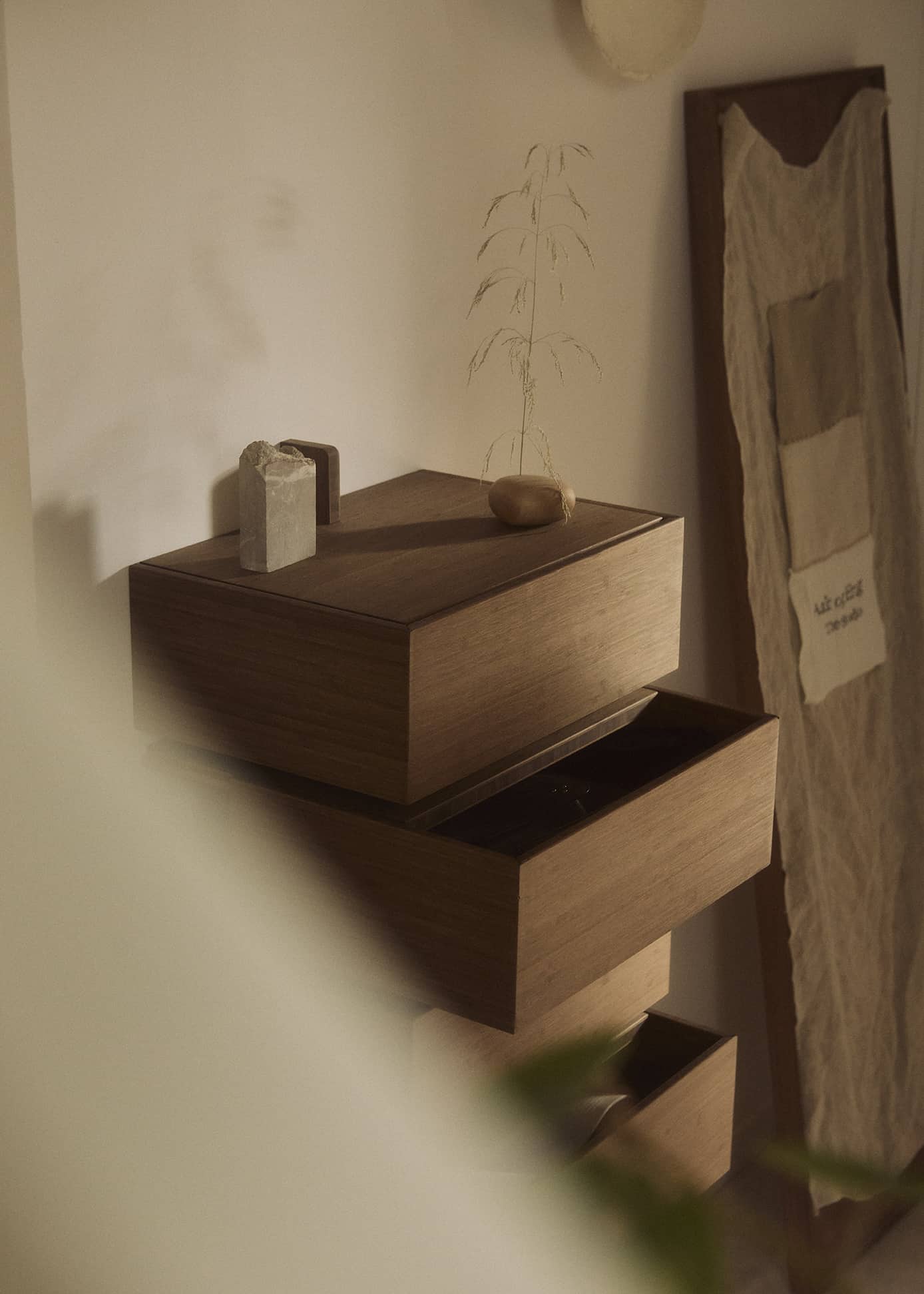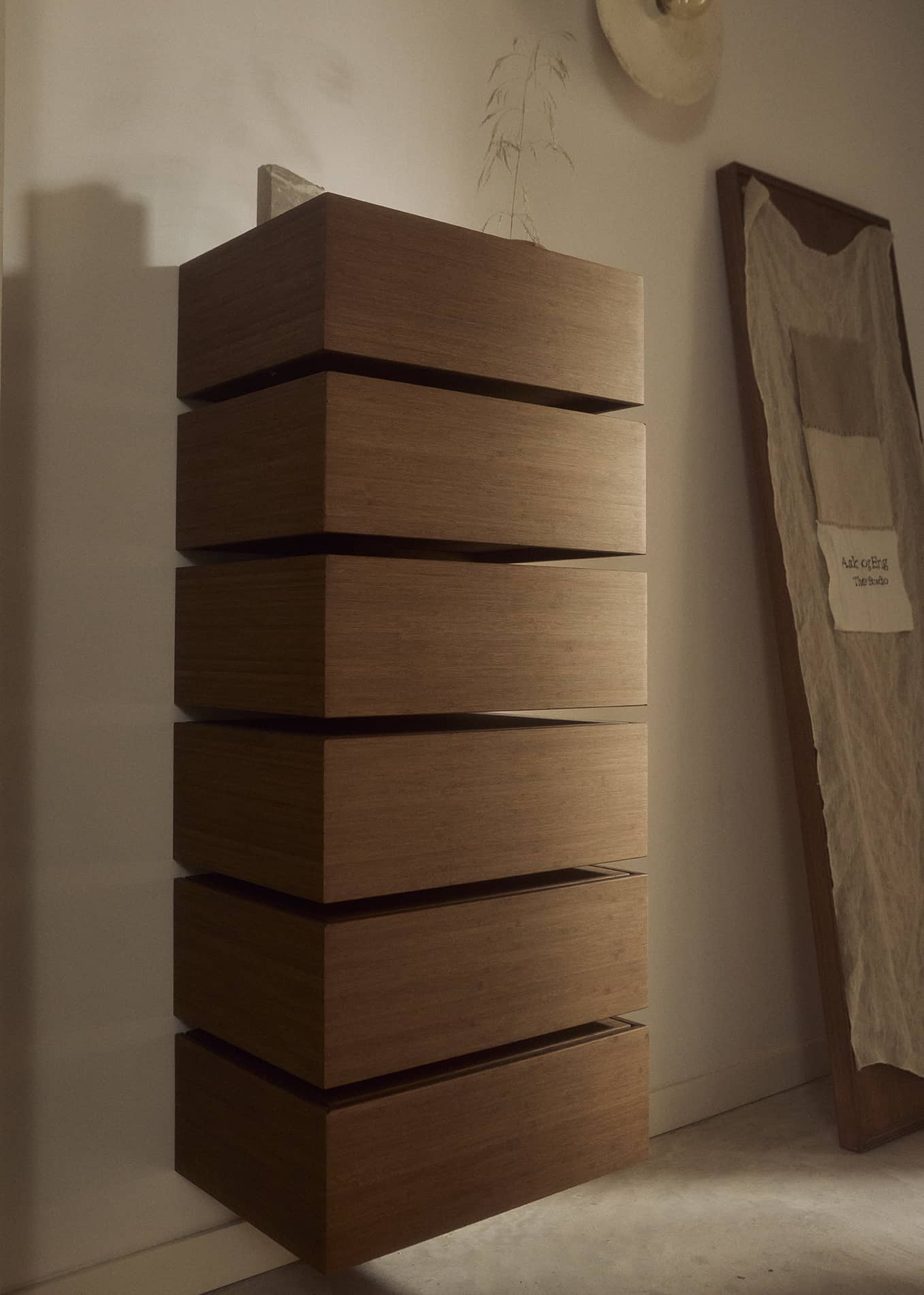 A modular storage system characterized by a floating silhouette. The Hako series eliminates the need for a traditional base, allowing for customizable clusters or expansive storage walls. It is a solution for the organized environment, where functional storage meets minimalist elevation.